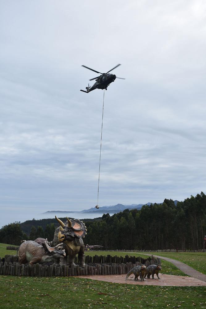 En esta ocasión se han trasladado al Museo un bloque con las vértebras del sacro articuladas y otro con las últimas vértebras dorsales. El tamaño y peso de ambos bloques, algo menos de una tonelada cada uno, junto con la dificultad de acceso al yacimiento y la relevancia del material recuperado han hecho necesaria la colaboración del helicóptero y personal de las Fuerzas Aeromóviles del Ejército de Tierra para su traslado al MUJA, donde se continuará trabajando en la preparación de las piezas halladas para su posterior análisis y estudio.