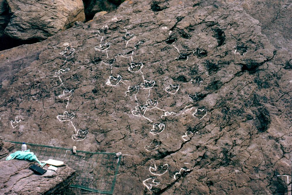 The total length of the walk along the base of the cliff is about 400 m. Apart from the footprints the cliff also contains striking examples of Jurassic desiccation cracks.