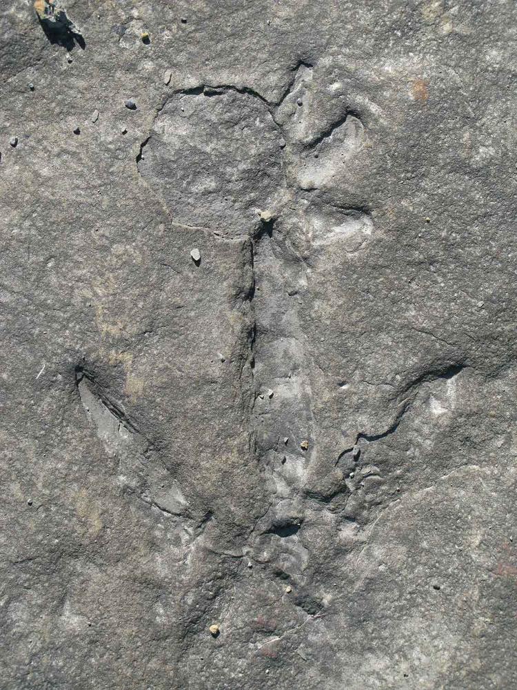 On the surface of the adjacent strata with the same orientation we can also see varios manus and pes footprints of quadrupedal dinosaurs (plan view), as well as the vertical section of an extremely large track, possibly belonging to a sauropod.