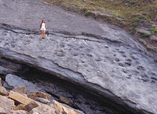 Such a succession, which exteds westwards along the cliff, comprises different layers rich in minute bivalves (“coquinas”) together with desiccation cracks and frequent dinosaur footprints. The latter occur on the surface of the strata either as roughly rounded depressions (quadrupedal dinosaur tracks) or as three-toed imprints (bipedal dinosaur tracks).