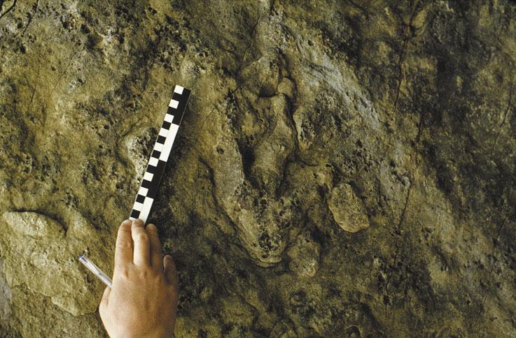 Above this alternating series there is a one-meter thick layer of conglomerate with siliceous clasts, and then alternating gray sandstones and red mudstones belonging to the Vega Formation. These deposits are fluvial in origin. Approximately 8 m above the conglomerate layer, there is a bed of sandstone tilted about 50º towards the northeast. At the base of this bed there are several tracks of tridactyl bipedal dinosaurs.