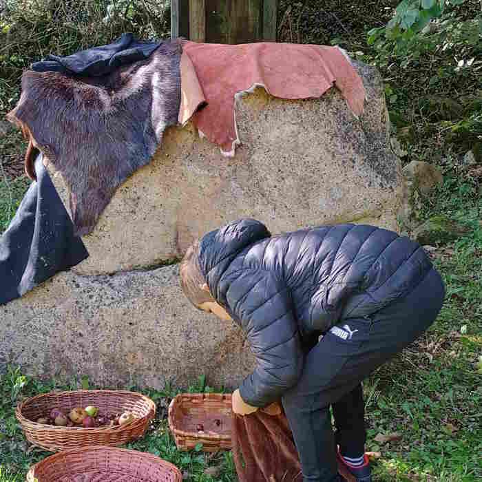 Equipados con un zurrón, tendremos que salir a buscar castañas y manzanas para el amagüestu, además de palos y piedras para hacer la hoguera como lo harían nuestros antepasados.