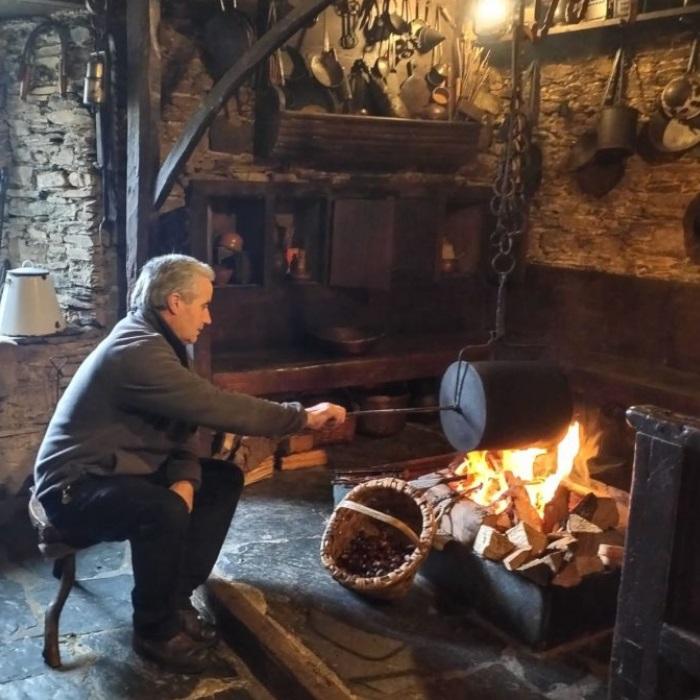 En tiempo de castañas, el Museo Etnográfico de Grandas de Salime "Pepe el Ferreiro" enciende a lareira de la Casa Rectoral y pone en marcha el tambor de asar castañas. Os invitamos a conocer el sistema tradicional para cocinar este alimento básico y a probar el resultado.