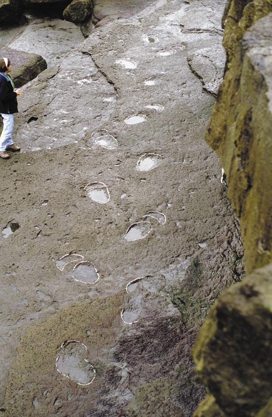 Una vez allí, se inicia el recorrido hacia el oeste por el pie del acantilado durante unos 600 metros, hasta llegar a un estrato de arenisca de la Formación Llastres, prácticamente horizontal. Sobre su superficie se conserva el rastro de un dinosaurio cuadrúpedo -estegosaurio- formado por 12 huellas consecutivas de manos y pies. En esa misma superficie se pueden ver además algunas icnitas tridáctilas dispersas pertnecientes a dinosaurios bípedos.