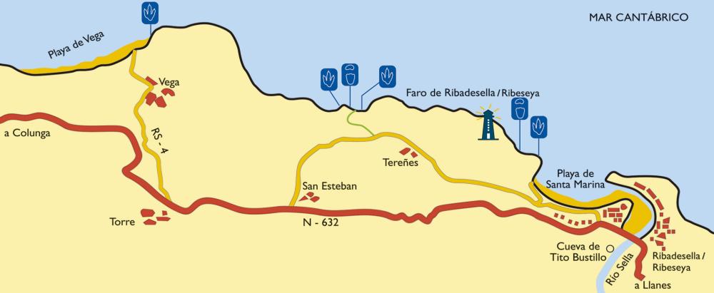 El acceso desde la carretera de la costa N-632 se encuentra en los alrededores de la localidad de Torre, unos 7 km al oeste de Ribadesella. De allí parte una carretera asfaltada de 2 km que nos conduce hasta la misma playa de Vega.